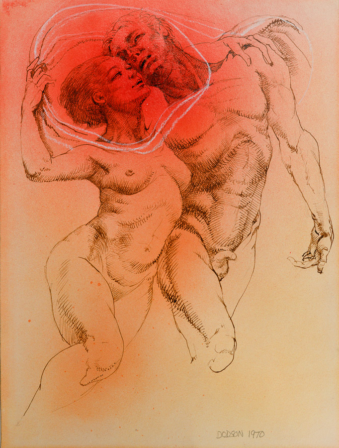 Couple in Love Submitted on Thu, 09/27/2018 - 16:31 by Carlin Ross pen/ink/spray paint 14" x 10.5" 1970 This is a sketch showing the couple has their heads in the sky of illusion. Their heads are completely detached from the body.